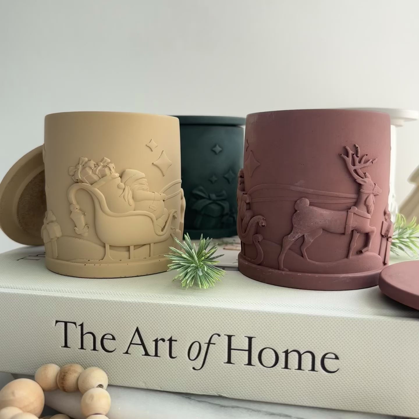 The concrete round vessel is a festive and eye-catching piece, perfect for the holiday season. The exterior of the vessel features a detailed depiction of Santa's sleigh, intricately carved or embossed into the concrete.